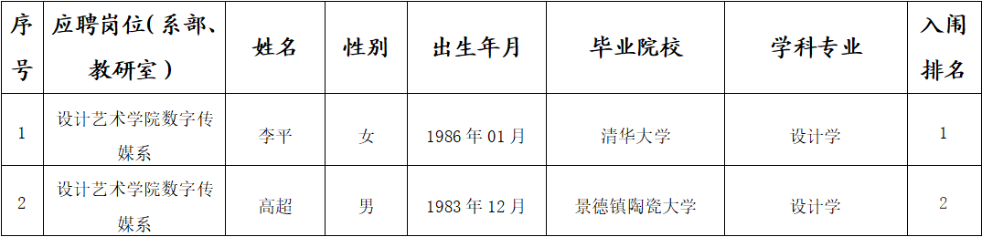 根据《景德镇陶瓷大学2025年高层次人才招聘公告》精神,设计艺术学院开展了2025年第二批博士人才专业面试考核,现将入闱体检(心理测试)人员名单公布如下: