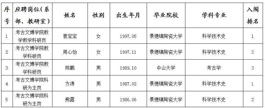 根据《景德镇陶瓷大学2026年高层次人才招聘公告》精神,考古文博学院开展了2026年第一批博士人才专业面试考核,现将入闱体检(心理测试)人员名单公布如下: