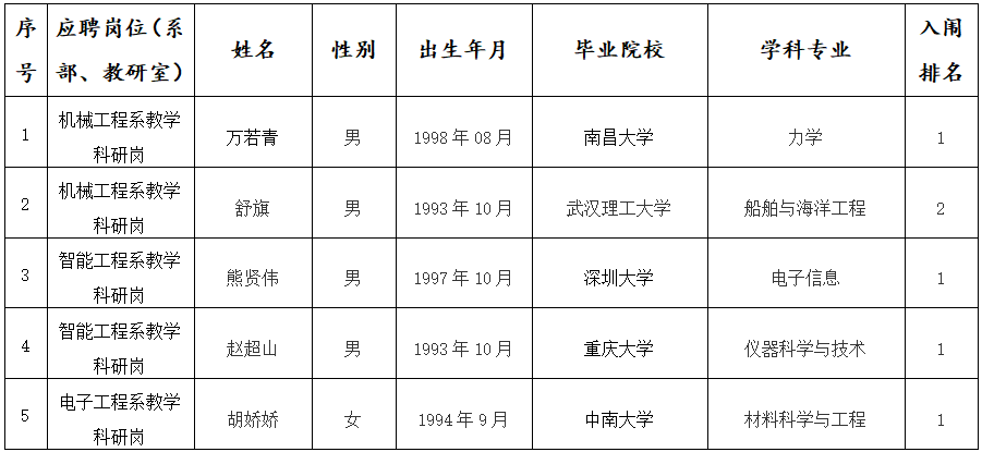 根据《景德镇陶瓷大学2026年高层次人才招聘公告》精神,机械电子工程学院开展了2026年第一批博士人才专业面试考核,现将入闱体检(心理测试)人员名单公布如下: