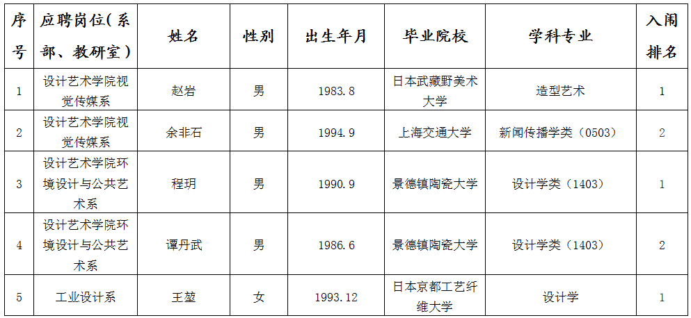 根据《景德镇陶瓷大学2026年高层次人才招聘公告》精神,设计艺术学院开展了2026年第一批博士人才专业面试考核,现将入闱体检(心理测试)人员名单公布如下:
