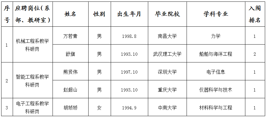 根据《景德镇陶瓷大学2026年高层次人才招聘公告》精神,机械电子工程学院开展了2026年第一批博士人才专业面试考核,现将入闱体检(心理测试)人员名单公布如下:
