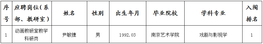 根据《景德镇陶瓷大学2026年高层次人才招聘公告》精神,数字艺术学院开展了2026年第一批博士人才专业面试考核,现将进入体检(心理测试)人员名单公布如下: